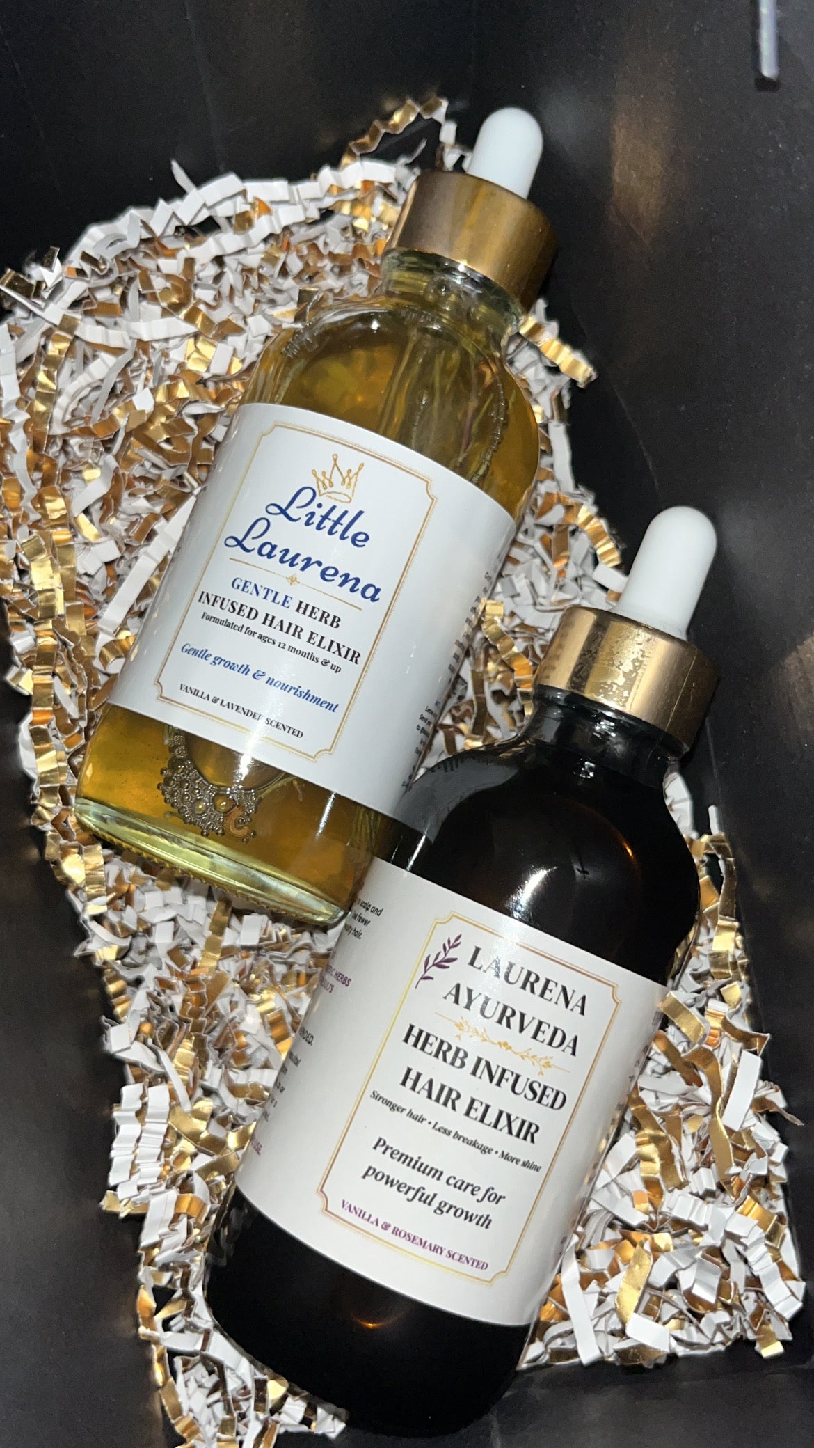 Upgrade your family’s hair ritual with our Crown Connection Duo—the ultimate Laurena Ayurveda pairing. Our signature Adult Elixir restores strength and shine to grown-up strands, while the Little Laurena Elixir is crafted for the gentlest care on delicate young hair. Together, they deliver Ayurvedic luxury for every generation—because healthy, radiant crowns start at home. 👑✨🌱