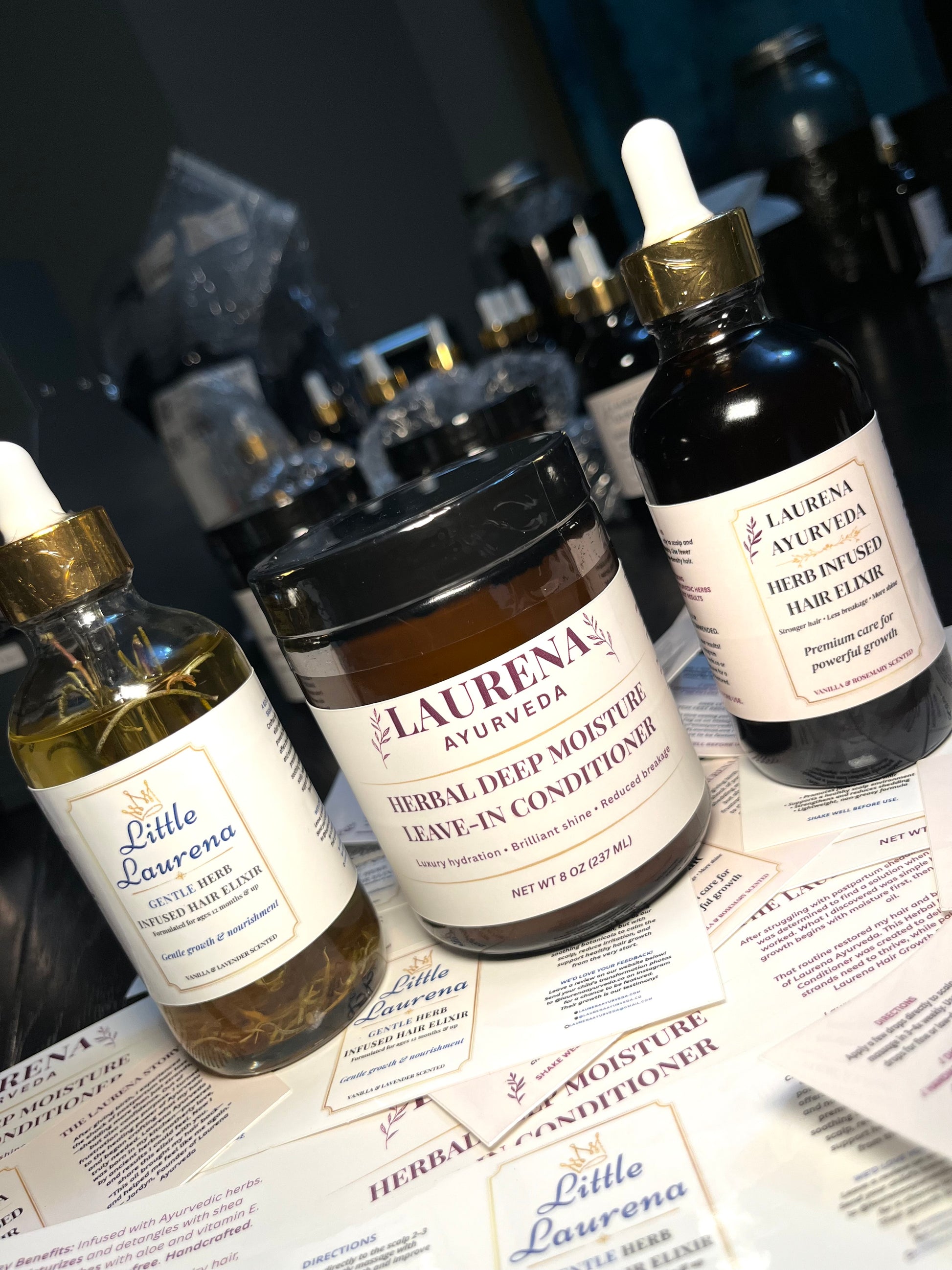 β’ Laurena Hair Growth Elixir β seals in moisture and stimulates growth with powerful Ayurvedic herbs.
